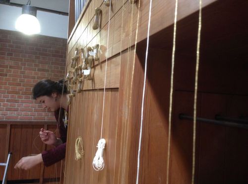 Anticipation, 2018. Site-specific installation in response to Husk’s historic organ, comprising 42 threads: 39 gold for its remaining front pipes, 3 white for the pipes that are missing.